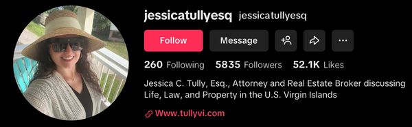 Attorney Jessica Tully shares short, practical videos on TikTok as @jessicatullyesq, with 1.6 million views and nearly 6,000 followers, covering real-world legal topics and updates from practice and life in the U.S. Virgin Islands.